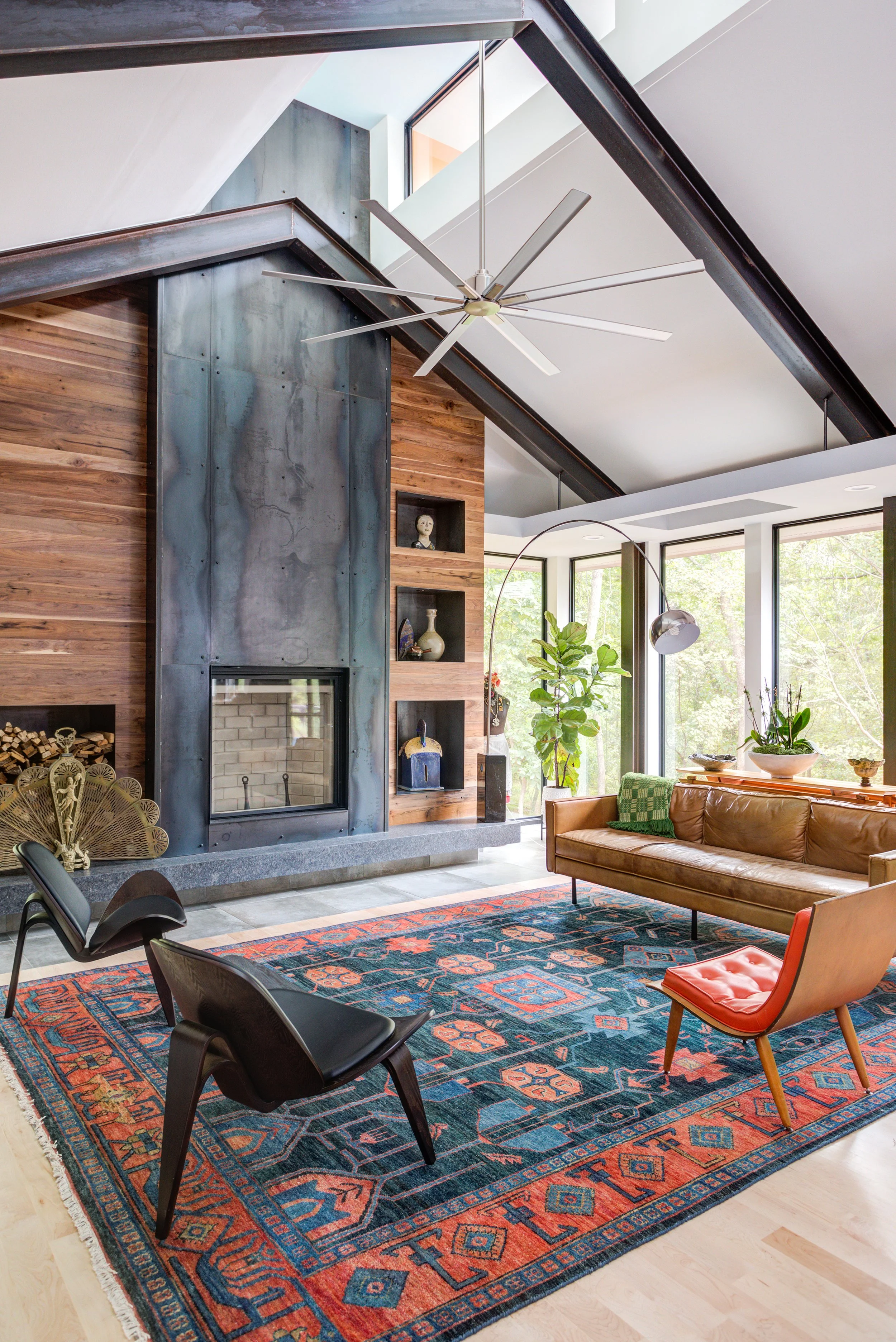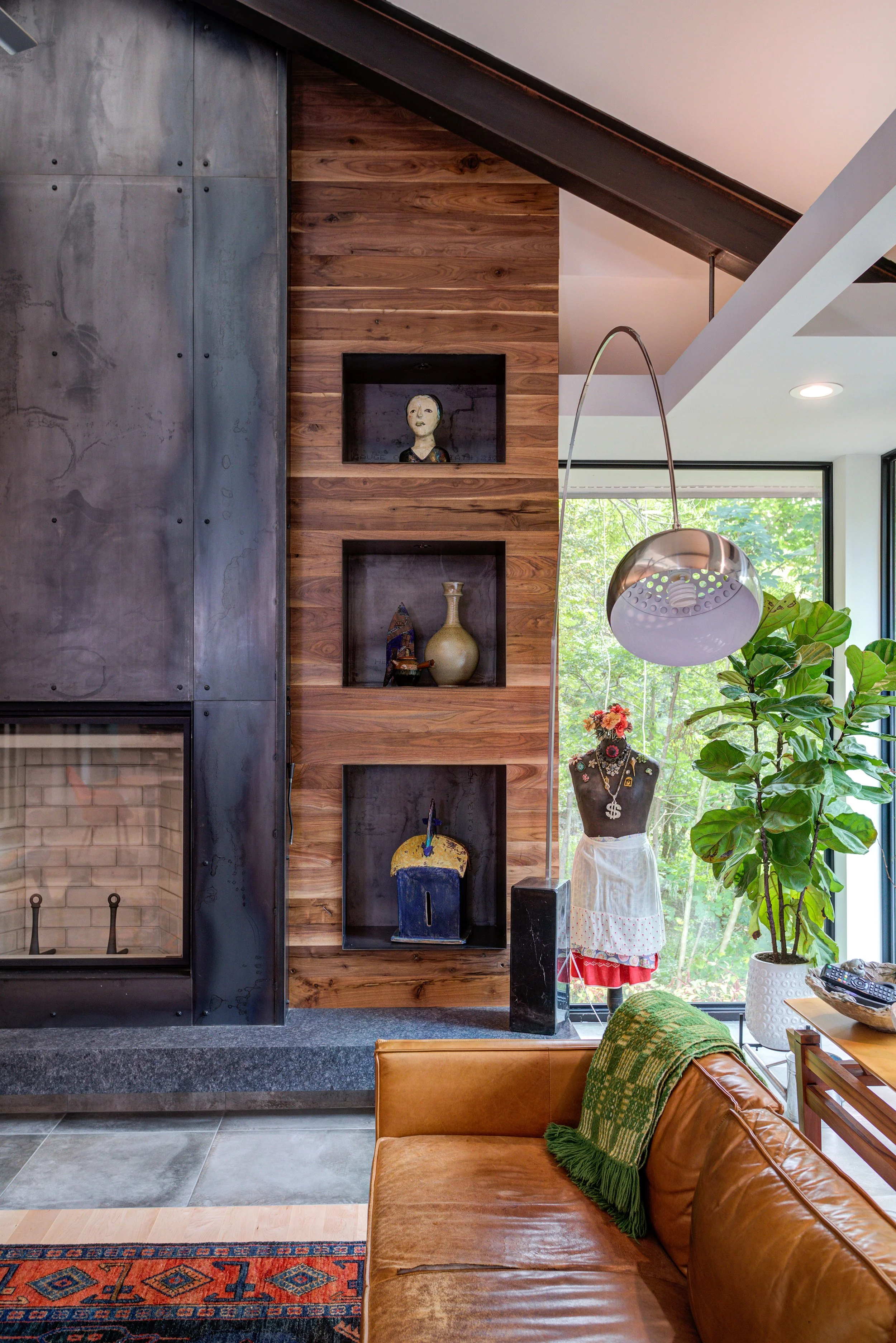 Custom steel fireplace surround with walnut milled from the site