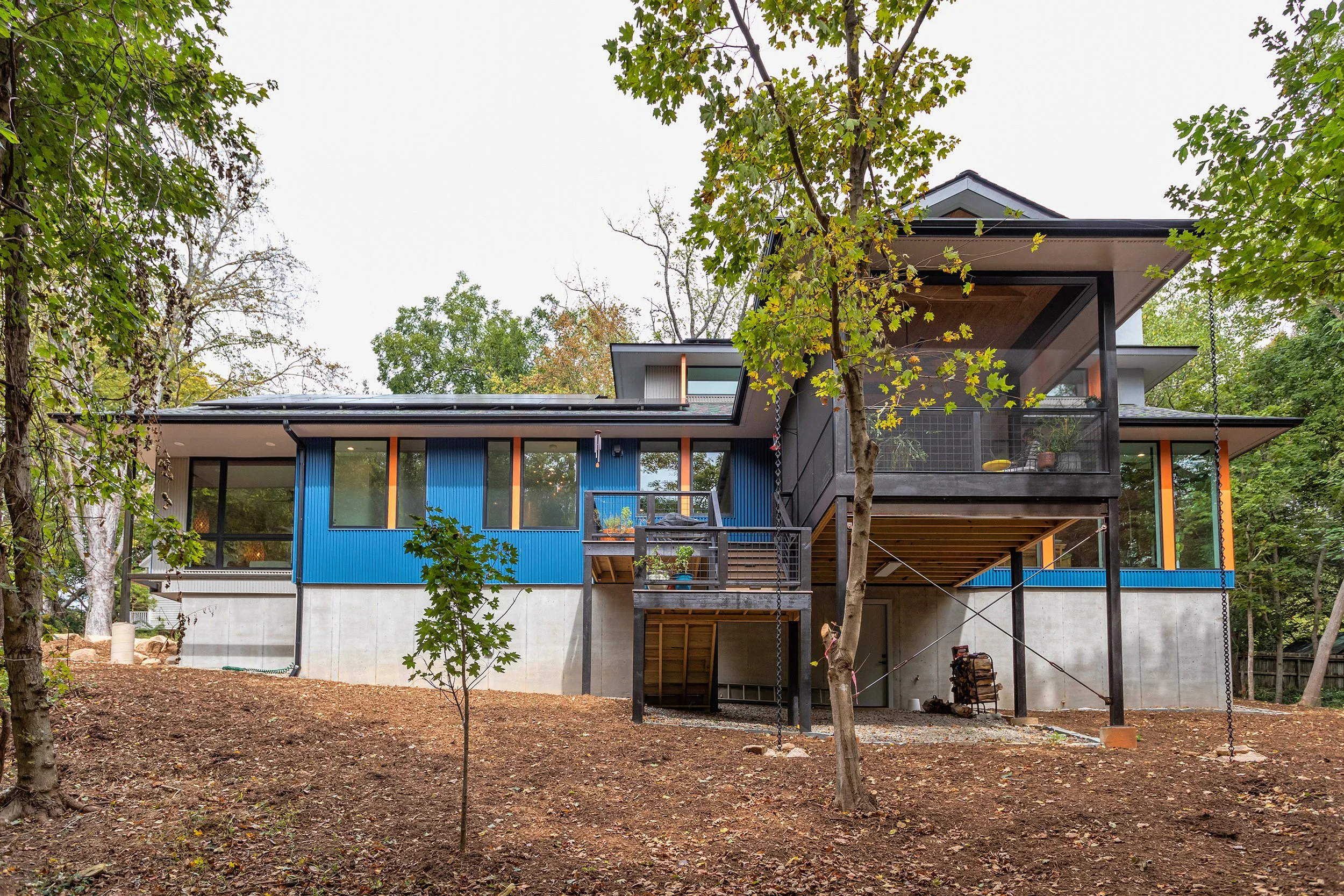 Screen porch has view down to the Eno, yet is a two minute walk to Weaver Street Market! Cast in place concrete foundation with corrugated metal siding.